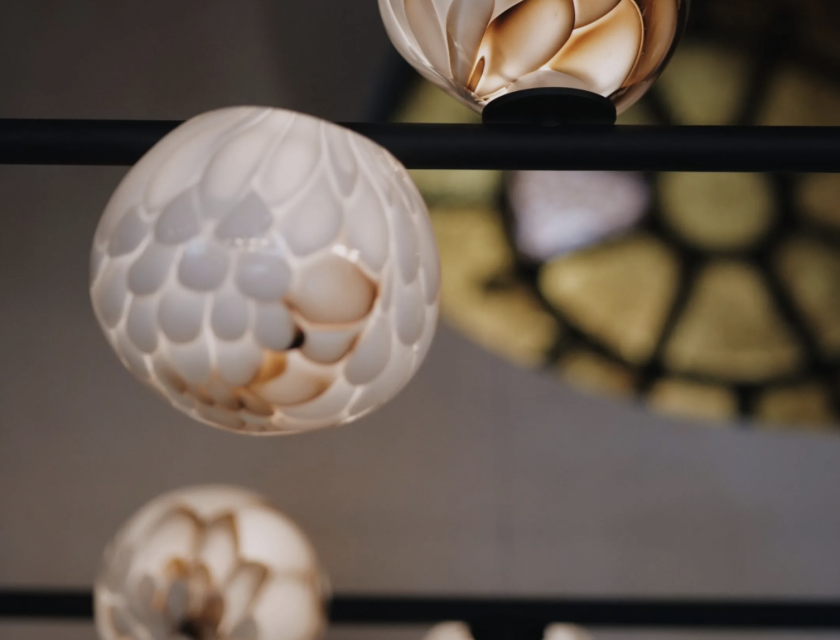 In a space where light moves slowly, where sound is softened by texture and stillness, the glass forms of the Bocci 118 series float like a whisper.